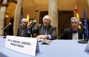 A la presentación de la obra ha acudido hoy el ministro de Exteriores, Miguel Ángel Moratinos, junto al embajador y director de la obra, Joaquín Ortega, y el profesor Ángel Viñas.