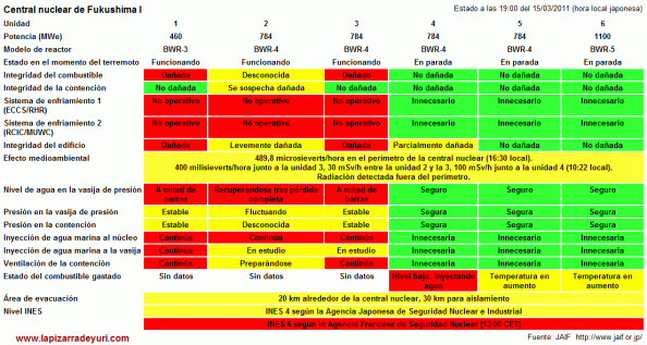 Fukushima Estado a las 19.00 hh del 15/03/2011 hora local japonesa