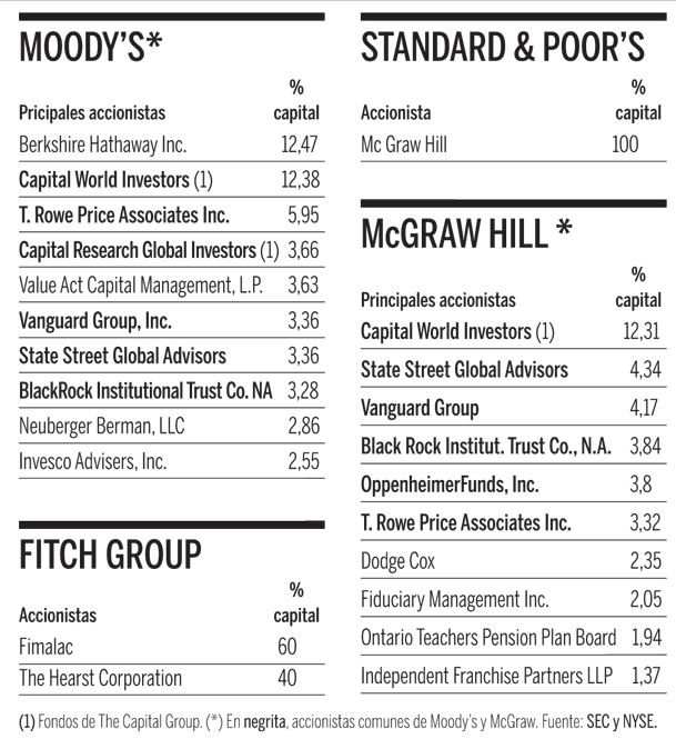Las grandes agencias de ráting, sobre las que recaen duras críticas por su papel en la crisis de la deuda, comparten entre sus accionistas a las grandes gestoras de fondos. El debate respecto a su futuro está sobre la mesa.