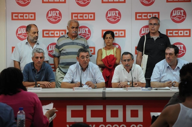 29.08.2011.- Las organizaciones sociales y los sindicatos CCOO, UGT y USO, reunidos esta mañana en la sede de CCOO para estudiar acciones contra la reforma de la Constitución que establece un límite de déficit, y para exigir la convocatoria de un referéndum, han decidido realizar concentraciones los días 31 de agosto y 1 de septiembre en distintas localidades del país, víspera de la discusión en el Congreso de la iniciativa pactada por PSOE y PP. Asimismo, han acordado apoyar las demás concentraciones y movilizaciones que se convoquen estos días -en particular la recogida electrónica de firmas-, y celebrar una manifestación en Madrid el día 6 de septiembre, a las 19h, entre Cibeles y Sol, antes del debate en el Senado.