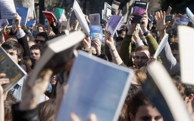 El mensaje es claro: no a la violencia. Los concentrados portanlibros en alto y no paran de repetir: «estas son nuestras armas». Estudiantes, representantes políticos de la oposición, responsables sindicales, profesores y padres de alumnos, están siendo vigilados desde el aire por un helicóptero del Cuerpo Nacional de Policía y por varias unidades de la Policía Local en tierra.