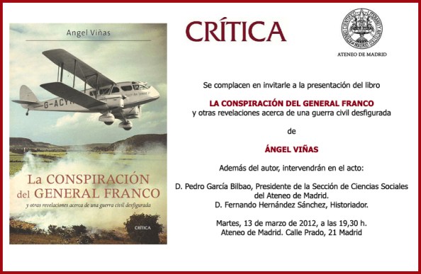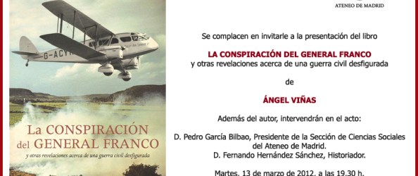 El próximo martes día 13 de marzo, el profesor Ángel Viñas presentará la nueva edición de su libro La conspiración del General Franco», editado por Crítica. Le acompañaremos en el acto, el profesor Fernando Hernández SáncHez y un servidor, Pedro A. García Bilbao, desde mi condición de miembro de la Sección de Ciencias Sociales del ATENEO DE MADRID (Calle Prado 21, junto a las Cortes). Les recuerdo que la entrada a los actos es libre. Sería una excelente oportunidad para coincidir. Les adjunto un PDF descargable con la invitación.