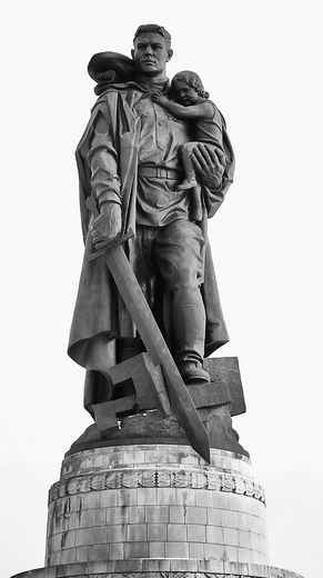 Esta imagen que aquí situamos se encuentra en el Parque de Treptow en Berlín, en un memorial dedicado a la victoria sobre el nazismo y al recuerdo a los soldados soviéticos que entregaron sus vidas en esa lucha. La escultura de representa de forma idealizada a un soldado soviético protegiendo a una niñita alemana, mientras porta la espada con la que ha roto la cruz gamada que está en el suelo. El conjunto está inspirado en la historia de algunos soldados reales que protagonizaron hechos parecidos (Trifon Lukyanovich, Nikolai Maslov), pero más allá de si eso ocurrió una o mil veces y que sus protagonistas sobrevivieran o no, su innegable sacrificio salvó a la humanidad, representada por la pequeña. Esta estatua de Yevgeny Vuchetich, es hermosa y profundamente sincera; restaurada en 2006, la estatua se alza de nuevo en el parque memorial de Treptow.