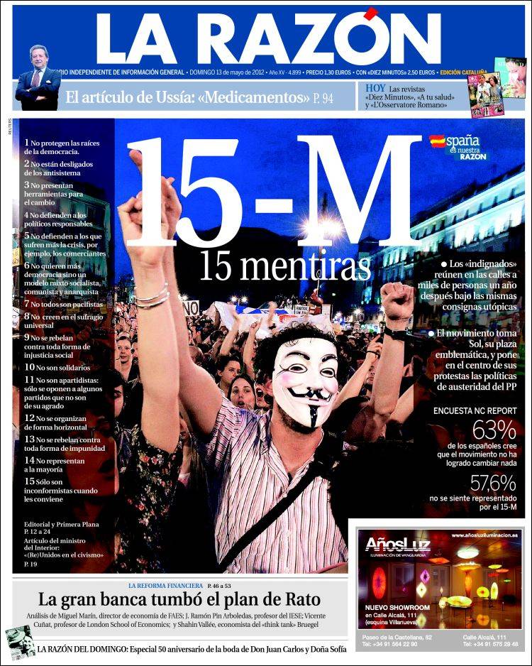 La monarquía del IBEX35 está en crisis. El PP —con la inestimable colaboración previa del PSOE— está destruyendo el sistema democrático y todo el sistema de derechos sociales y laborales que el capitalismo se vio obligado a tolerar durante los años de la guerra fría. Acabada esta, el sistema vuelve por donde solía, por la aniquilación de los derechos de los trabajadores y por una sociedad despiadada y darwinista social. Estamos ante una «contrarrevolución» cruel, brutal, reaccionaria, ante una guerra de clases emprendida por el poder económico a través de su correa de transmisión política, el gobierno. ¡que razón tenía Marx cuando dijo que los gobiernos son el consejo de administración de la burguesía! El estado está siendo destruido. Todo lo avanzado en décadas aniquilado… Esto no lo vamos a parar con una quedada montada en FB. Quien deje creer eso o es un inconsciente u otra cosa.
