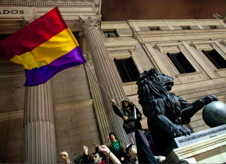 Formaban un nube que subió por la Carrera de San Jerónimo desde Neptuno. Justo a la altura del Hotel Palace, dejaron de ser una alegre algarabía que regresaba a casa, para convertirse en un grupo de ciudadanos —estos sí— dispuestos a jugársela. Echaron a correr en masa, entre el estupor del puñado de guardias, les desbordaron muy fácilmente. los policías quedaron como piedras en medio de un torrente, rodeados, sumergidos, impotentes para detener la corriente. Una primera ola subió las escaleras y proclamó su triunfo en la columnata y junto a los leones, atrajeron toda la atención; les dio tiempo a llenar la escalinata y gritar por el éxito. Decenas y decenas de teléfonos grabaron la escena y tomaron fotos e imagen, la bandera tricolor ondeo al aire; la imagen está ahí. Han acallado la acción , la han borrado de la historia, pero está ahí, ocurrió. La foto está siendo usada para ilustrar propuestas vacías e inocuas, pero da igual, se explica por sí sola, no es digerible por mucho que lo pretendan: siempre habrá alguien que pregunte ¿qué pasó? ¿quienes eran? ¿qué significa esa bandera? ¿cuando ocurrió eso? Y hay una respuesta sencilla: fue algo a lo que este régimen tiene miedo. Miedo a que se repita. Miedo a que no sean cientos, sino a que sean cientos de miles los que enarbolen esa bandera camino de las Cortes y a que ese grito se oiga dentro de las Cortes: ¡abajo el Régimen! ¡Viva la República! recuperemos nuestra legalidad republicana perdida y construyamos un futuro donde brille la fraternidad, donde el bien común sea prioritario, en el que el Borbón y su Corte de banqueros corruptos sean enfrentados a sus responsabilidades ante el pueblo —este uso sí es aceptable—.
