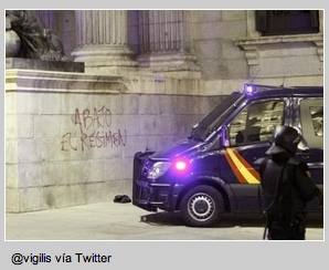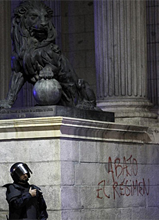 La reacción policial fue inmediata. Sonaron los silbatos y las llamadas por radio alertaron a las dotaciones de guardia, sonó todo lo que tenía que sonar y acudió la fuerza disponible al completo, corrían, se agruparon y cargaron directamente sin formar una línea. Las escaleras debían ser despejadas, la multitud dispersa. La ocupación, sí, sres, la ocupación de las Cortes, de su fachada simbólica con los leones y columnas, se había logrado y la fuerza no podía consentirlo. La policía actuó para «recuperarla». Cargaron como en un abordaje pirata, dispersos y con las armas en la boca. La violencia sólo entraba en los planes de la policía y ante los golpes y la fuerza los jóvenes echaron a correr. Pero las cosas no habían consistido sólo en eso. Simultáneamente a la acción en la escalinata, en la peana de las escaleras, en el muro lateral inferior, la masa de gente formó una pantalla y amparados por las otras acciones y la oscuridad que caía, salieron los sprays de pintura. «Abajo el régimen», quedo escrito en la pared de las Cortes, al lado mismo del lugar en el que los guardias civiles golpistas pactaron su impunidad en el llamado «pacto del capó» el 24 de febrero de 1981. Pero el que unos jóvenes subieran unas escaleras y alzaran una bandera es mucho más garve para este estado que el que cientos de militares armados secuestren a las Cortes y al Gobierno. Aquellos guardias salieron por las ventanas con sus armas y con sus armas marcharon a casa impunes. Los jóvenes tuvieron que correr ante los golpes, los guardias —viseras bajadas, porras y pistolas, la tensión en su gesto, los cuerpos enervados— despejaron la zona para comprobar humillados que unos jóvenes decididos habían dejado un grito mudo —este sí vale—, en la pared de las Cortes: «Abajo el régimen».