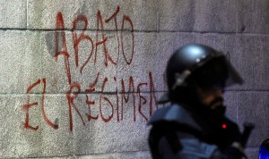Uno de ellos ha realizado una pintada debajo de uno de los leones en la que se puede leer ‘Abajo el régimen’. Otro ha hecho otra pintada en una puerta metálica de acceso al Congreso, donde ha dibujado un punto, una raya y un punto.