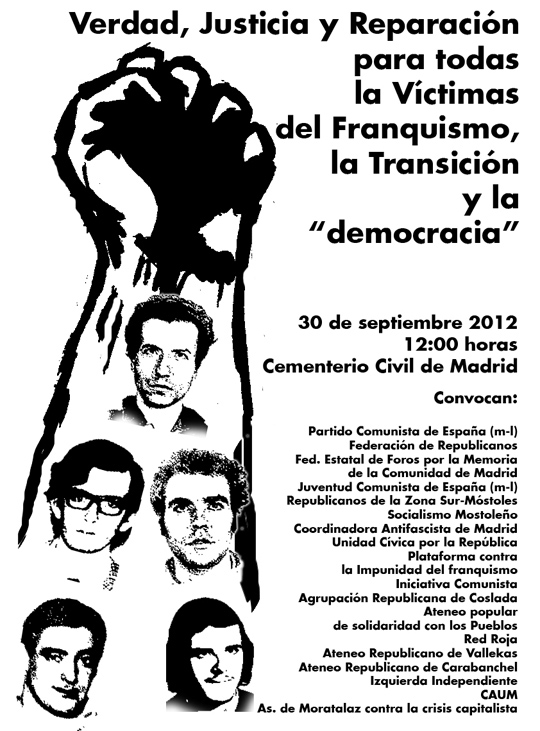 El 27 de septiembre de 1975 el régimen de Franco ejecutó a Juan Paredes Manot (Txiqui), de 21 años, Ángel Otaegui, de 33, José Luis Sánchez Bravo, de 22 años, Ramón García Sanz, de 27, y José Humberto Baena Alonso, de 24. Todos ellos pertenecían a bandas armadas. Los dos primeros a ETA y los tres siguientes al FRAP. Serían los últimos cinco presos asesinados por la dictadura. Sus ejecuciones desnudaban la verdadera cara del régimen y dejaban en evidencia a las potencias occidentales que permitieron el asentamiento y desarrollo de la dictadura.Durante la mañana de este domingo, diversas asociaciones de memoria histórica y agrupaciones de izquierdas han rendido homenaje a las cinco víctimas en el cementerio civil de Madrid, frente a la tumba de Ramón García, y han recordado al centenar de asistentes que la mejor manera de rendir homenaje a los caídos durante la dictadura es “luchando por los derechos sociales y laborales de los trabajadores”.