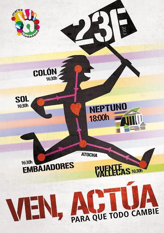 El núcleo que ha diseñado las movilizaciones 23 F es el mismo que inspiró el 15 M y luego el 25 S. Han ido variando su estrategia de aproximación a la gente… pero buscan lo mismo… despolitizar las luchas y tomar la iniciativa para adelantarse a las fuerzas políticas que intentan organizar la resistencia. Fueron desbordados el 15M y el 25 S, ahora lo intentan de nuevo el 23 F…. con la idea esta de las mareas fomentan la división en gremios y sectores, combaten a los partidos y a los «políticos»,, facilitan que los sectores en lucha se agoten en debates internos entre los que quieren reivindicaciones gremiales y los que tienen solidaridad de clase. Una vez mas se tiene que emplear tiempo en combatir los prejuicios contra las banderas, los partidos, la lucha de clases, la República… Mirad la simbología que se usa, está desconectada de la tradición de la izquierda…. estas cosas no son nunca por casualidad….