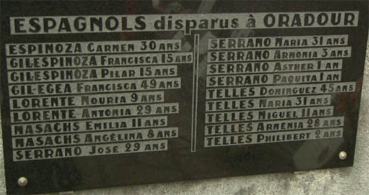 La familia Lorente Pardo, madre y dos hijos, procedían de Barcelona y llevaban en Francia desde el éxodo de enero de 1939; la madre, Antonia, era de Murcia. Sus nombres: Antonia Pardo (29 años), Nuria Lorente Pardo (9 años) y Francisco Lorente Pardo (11 años). Las hermanas Emilia y Angelina Masachs, de 11 y 8 años, eran originarias de Sabadell y habían perdido a sus padres; se encontraban recogidas por las otras familias españolas. La familia Serrano Pardo estaba rehaciendo su vida en Francia. El padre, José Serrano Robles (29 años) era maestro de escuela y había marchado al exilio con su esposa María Pardo. Sus tres hijas habían nacido en Francia; la pequeña Armonía Serrano Pardo (nacida el 4/6/41, es decir de 3 años) y las gemelas de 1 año de edad, Esther y Paquita Serrano Pardo. La familia Téllez Domínguez procedía de Barcelona. El padre, Domingo Téllez (45 años) era originario de Zaragoza y se encontraba en Oradour con su esposa María Domínguez (31 años), y sus hijos Miguel (11 años), Armonía (8 años) y el pequeño Liberto, de dos años, nacido en Oradour. La española Carmen Silva, de 39 años, era de Bilbao y estaba casada con el francés Robert Pinede. Todos ellos (al menos 21 españoles, entre adultos y niños) fueron asesinados el 10 de junio de 1944.