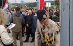 Comenzado el acto principal en la gran explanada de la fortaleza, fueron desfilando las delegaciones nacionales presididas por supervivientes y altas autoridades civiles y militares, seguidos de la participación más variada imaginable (trajes de época, familias con niños en carritos, inválidos en sillas de ruedas, boys scouts marciales y serios, escolares, un obispo polaco, sacerdotes ortodoxos, etc.). Al frente del grupo español, se colocaron los tres representantes de la embajada española, seguidos a distancia de los demás. Al llegar al final del recorrido, el encargado de negocios español inclinó la bandera monárquica ante la pirámide de coronas laureadas. En ese momento y ante los supervivientes y autoridades de todos los países, la delegada de Republicanos-RPS de Cantabria, Beatriz Sainz, mientras levantaba la bandera de la República exclamó con voz fuerte: “¡Esta es la bandera de España!”.