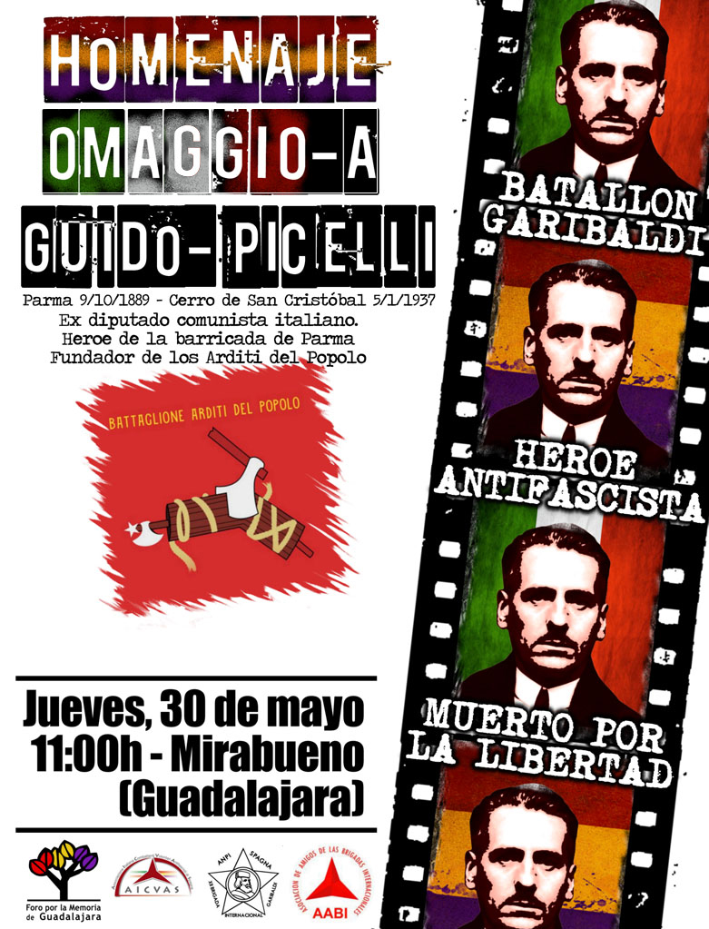 El próximo día 30 de mayo tendrá lugar en Mirabueno (Guadalajara) un homenaje a Guido Picelli, un combatiente antifascista italiano de mítico recuerdo, un hombre bueno y valiente, que plantó cara al fascismo en la Parma de 1922, que fue diputado con Gramsci y Matteoti, que hubo de marchar al exilio y mantuvo siempre su espíritu libre y su sed de libertad, que vino a España a combatir por su libertad y la nuestra. Picelli cayó ante el Cerro de San Cristobal, entre Mirabueno y Algora en enero de 1937 al frente de la compañía de choque de su batallón.