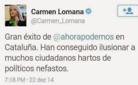 Empiezo entender que Monedero tenga tan cautivada a gente de la Beautiful People como Carmen Lomana, aunque hay que decir que se lo curra (todo sea por un puñado de votos). María del Carmen Fernández de Lomana Gutiérrez, es de esta gente guapa que antaño se dejaba seducir por la modernidad pija del PSOE, cuyo centro de gravedad está ahora en Podemos. Relacionada con la alta costura, en más de una ocasión no ha escondido su feeling con JuancaMone y éste, of course, se deja querer. Pero frivolidades aparte, estas anécdotas (que no son tan anécdotas en el fondo, ya que canalizan mucho voto tontolaba hacia Podemos) no serían factibles sin que Podemos hubiese metido en el armario (o directamente tirado a la basura) aspectos como el republicanismo, el apoyo explícito a Cuba y a Venezuela, etc.