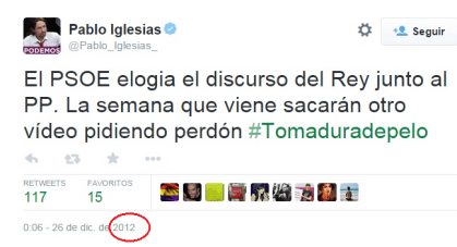En otras palabras, que el diagnóstico del rey (al que ahora PIT prefiere referirse como «jefe del estado») y el de Podemos vienen a ser coincidentes, al menos en parte. Y es que en apenas dos años, el cuento de Caperucita ha cambiado mucho. Como prueba este otro tuit de PIT sobre el discurso del rey en 2012: