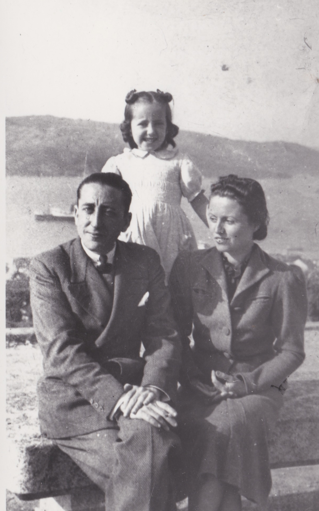 Donnina Alende con su esposo Carmelo Bilbao y su hijita Violeta. Es Vigo sobre 1942-3