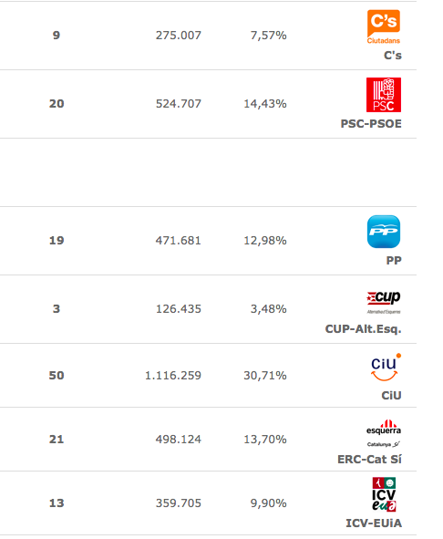 - Podemos e Iniciativa no suman más que Iniciativa a secas. Estancados. O en otras palabras, Podemos fracasa en lograr aportar algo a la campaña, quedando sus pretensiones muy defraudadas y su influencia minimizada. Su desgaste es brutal: Ni quiere ruptura con Madrid, ni en Barcelona. Su proyecto de «convivencia nacional» excluye la República y eso le resta credibilidad.
