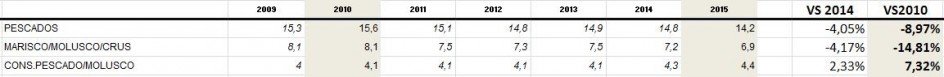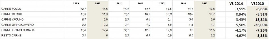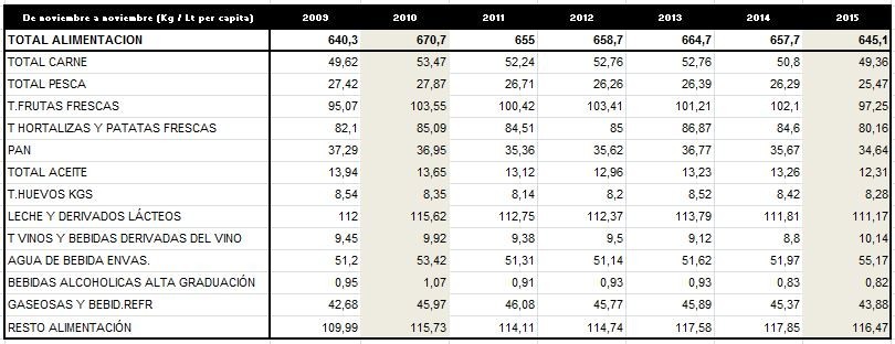 - Mientras otros sectores (comercio, vivienda, automóviles) se recuperaron en 2015, la ingesta alimenticia per cápita ha pasado en cinco años de 670 kg a 645.