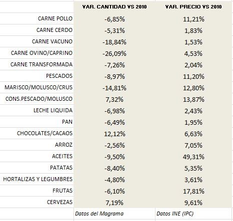 «El precio siempre es muy importante en época de crisis, sobre todo en las clases medias, que son grandes consumidores», explica Antonio López, presidente de la asociación de consumidores CECU. De hecho, el descenso en el consumo de carnes, embutidos, pescados, mariscos, leche, pan, arroz, patatas, hortalizas, legumbres y frutas ha venido acompañado de forma paralela con un encarecimiento del precio de estos productos, en mayor o menor proporción.
