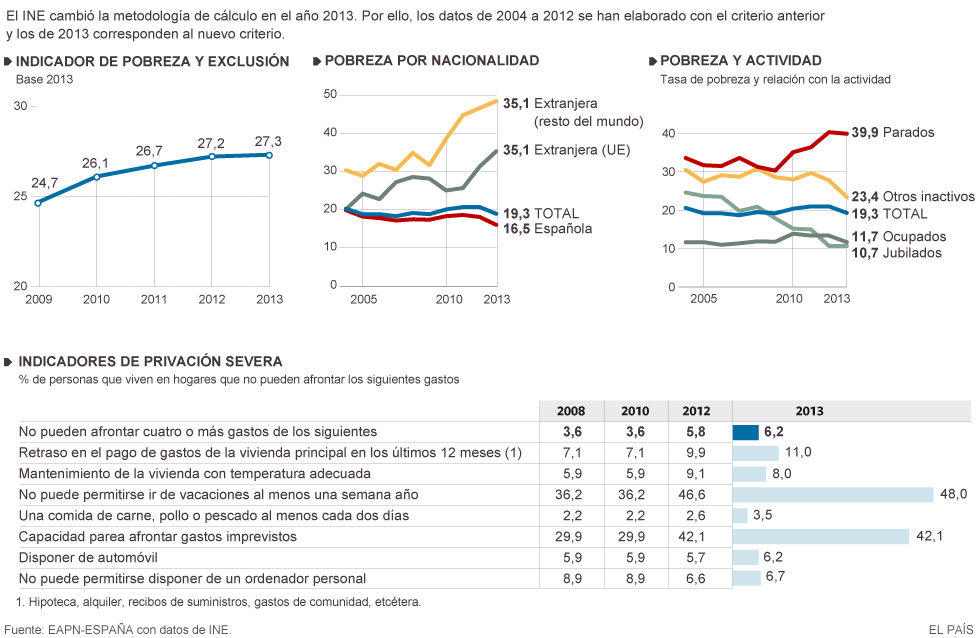 Julio Alguacil (Universidad Carlos III). “La tasa de pobreza es un indicador objetivo, pero es relativo. Ahora se usa más el término exclusión social, es menos economicista. La metodología más objetiva es aquella que trata de medir las condiciones de vida. El singular caso español ofrece un comportamiento diferenciado de los países de su entorno. Al contrario que los países de la UE 15, en España se dejaron pasar las oportunidades para disminuir la desigualdad en los periodos de bonanza. Todas las dimensiones de la pobreza sociológica muestran cómo sus distintos indicadores han ido empeorando en el período de crisis, poniendo en evidencia cómo la fractura social se ensancha, afectando ya la exclusión social al 21,9 % de los hogares españoles y al 25,1 % de la población (11,7 millones de personas). Mientras que el colectivo en situación de exclusión severa alcanza los 5 millones de personas (10,9 % de la población española). El núcleo central de la sociedad española, que denominamos como integración plena, ha perdido 15 puntos porcentuales desde el 2007 siendo ya minoritaria en el 2013 (34,3 %).