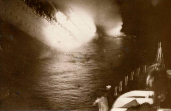 A las 02.00 próximamente se avistaron unas sombras por la amura de Br, ordenando el almirante disparar un proyectil iluminante por demora 315, pero en ese momento anunciaba la escucha submarina un ruido de turbinas muy próximo y a gran velocidad, demora 220, por cuyo motivo el almirante ordenó que el disparo iluminante se efectuase en esta última demora, sin dar tiempo a que esta orden se cumpliera por dispararse ya en la primeramente ordenada.