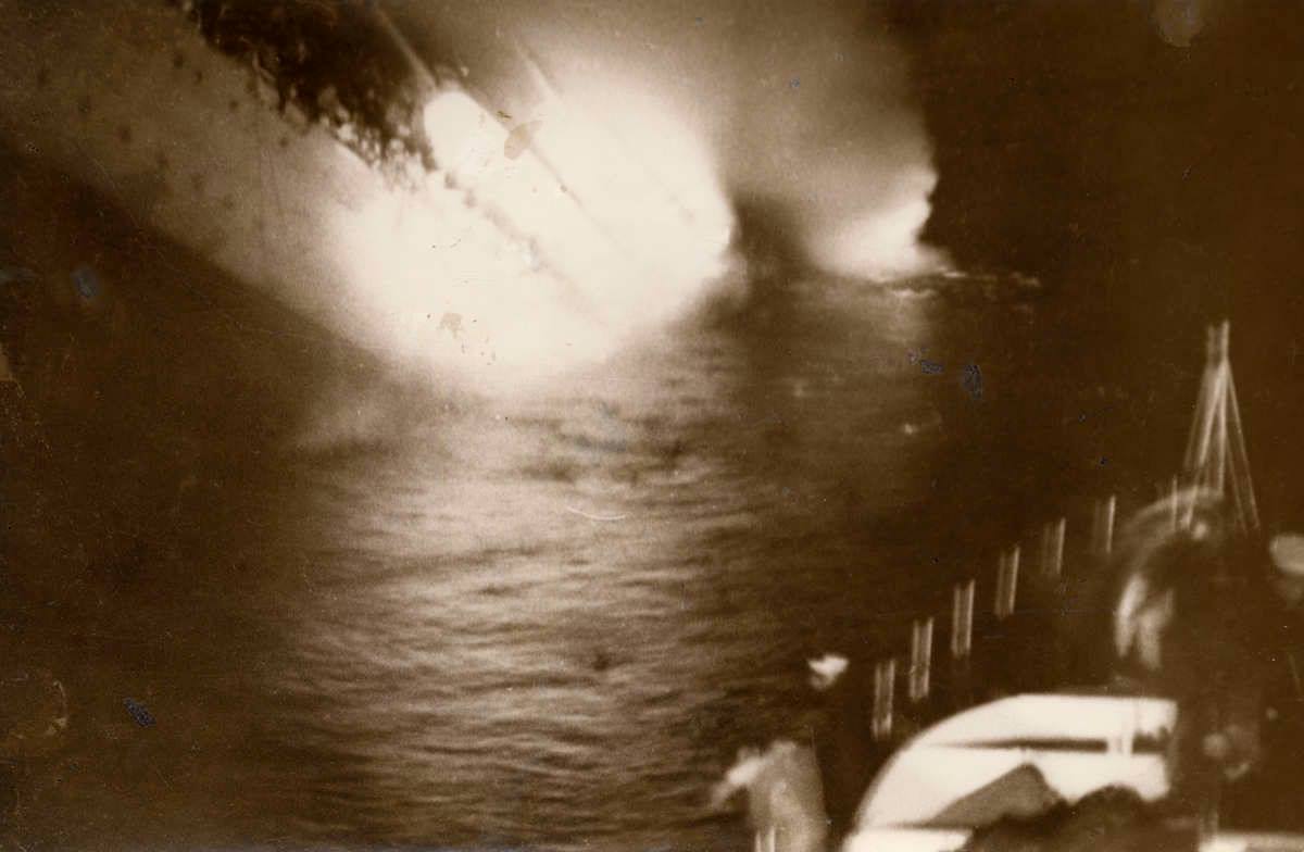 Al principio ignoraba dónde me encontraba, pero poco tiempo después al resplandor de un gran incendio en cubierta a la altura de la chimenea pude comprobar que me encontraba en el espacio de los lavabos de fogoneros, se veía una gran brecha en el costado de unos 10 ó 12 metros, por la cual penetraba la mar mezclada con petróleo y hacia crujía en el sitio correspondiente a las calderas una gran columna de humo muy picante. Inmediatamente me incorporé y trepé por entre los restos a la cubierta superior y de ésta a la cubierta alta, oyendo continuas explosiones que cimbreaban al buque.