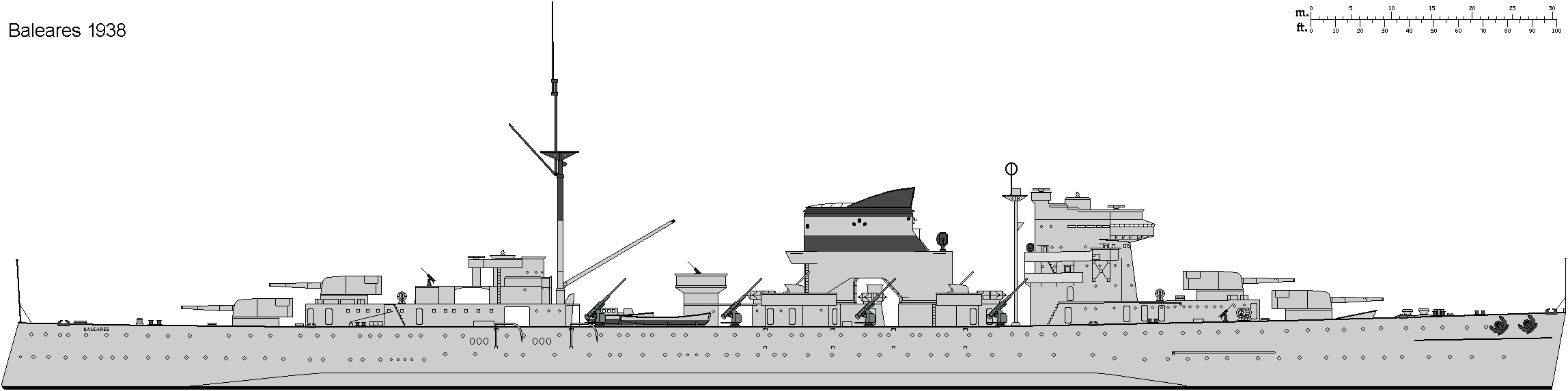 Perfil del Crucero «Baleares», Armada de la república española, incorporado a la flota facciosa tras la pérdida de la base de El Ferrol.