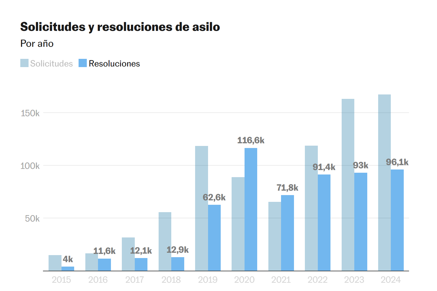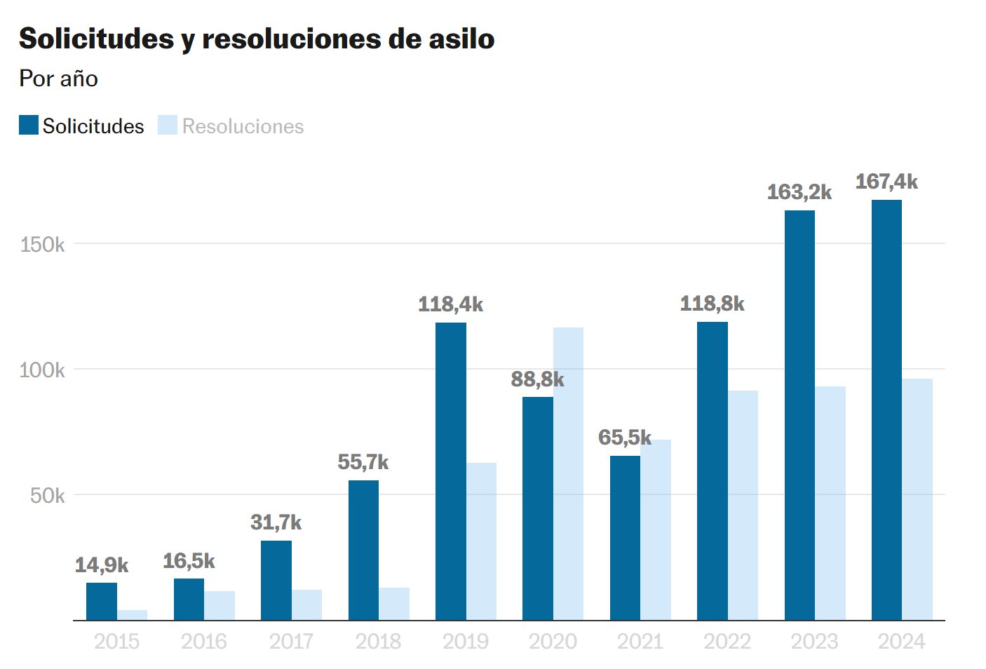 El impulso lo protagonizaron los latinoamericanos. Primero los venezolanos, que iniciaron un éxodo masivo, después los centroamericanos y los colombianos, a quienes España suele denegar sus solicitudes de protección. Actualmente, ocho de cada 10 latinos que piden asilo en Europa lo hacen en España y suponen más del 75% del total de peticiones en el país. En 2024, el listado de países de origen de los solicitantes lo encabezaron, de lejos, Venezuela (66.134 peticiones) y Colombia (40.140). Sin embargo, ha habido un número creciente de malienses que se juegan la vida en el mar para llegar y pedir asilo, lo que ubica a esa nación como la tercera en el listado, con más de 10.600 solicitudes.
