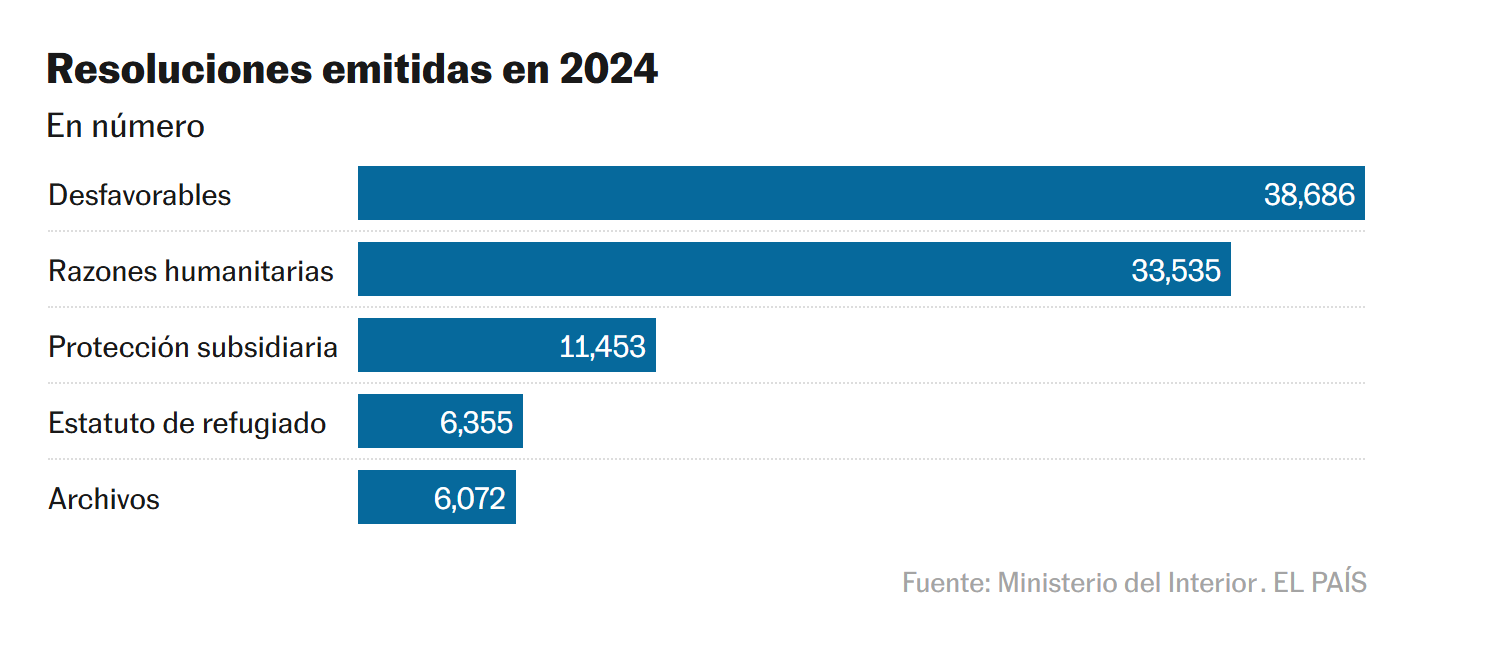 En número: Desfavorables 38,686 Razones humanitarias 33,535 Protección subsidiaria 11,453 Estatuto de refugiado 6,355 Archivos 6,072 Fuente: Ministerio del Interior EL PAÍS