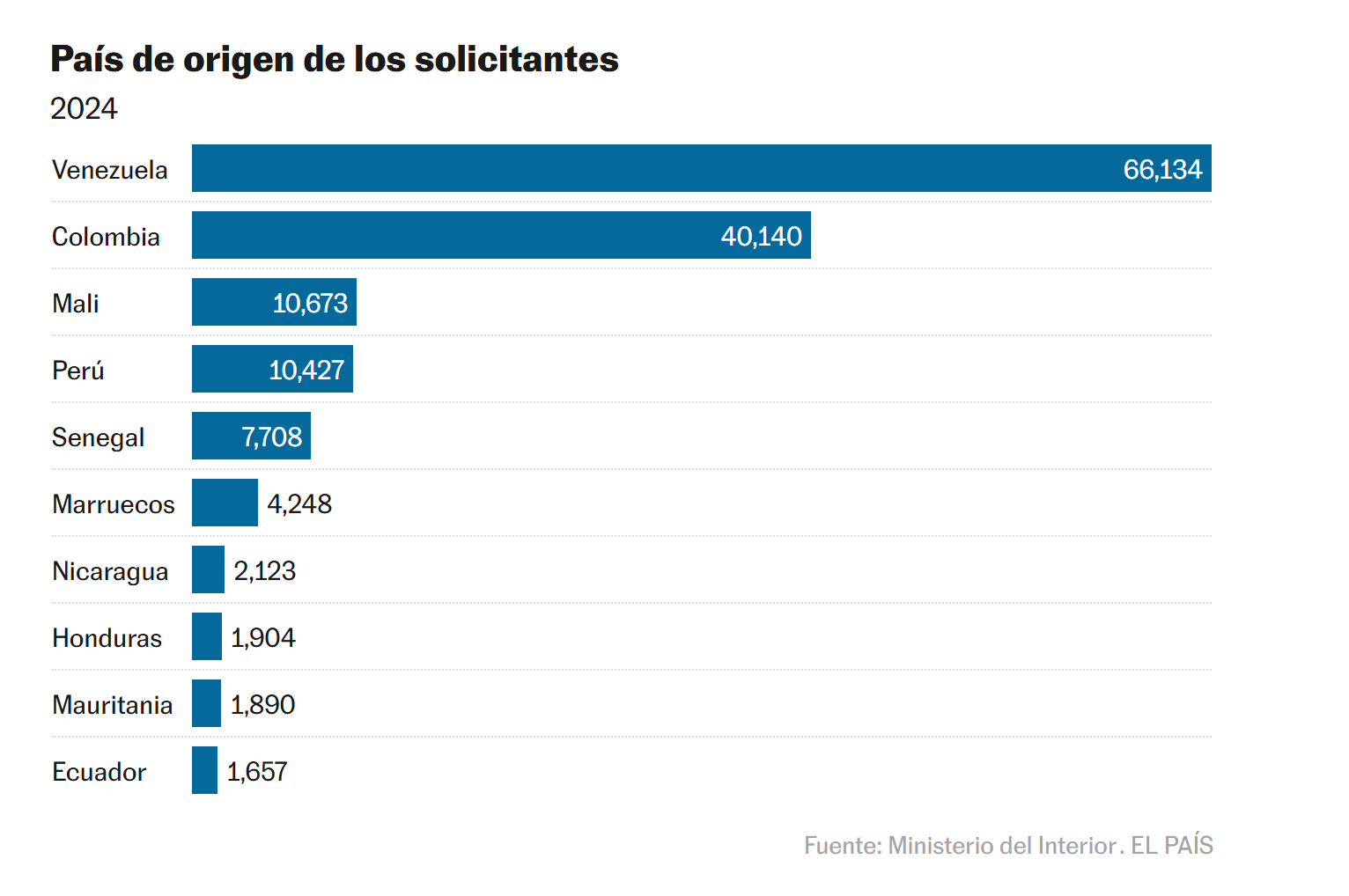 2024. Venezuela. 66,134. Colombia. 40,140. Mali. 10,673. Perú. 10,427m Senegal 7,708 Marruecos 4,248 Nicaragua 2,123 Honduras 1,904 Mauritania 1,890 Ecuador 1,657 Fuente: Ministerio del Interior EL PAÍS