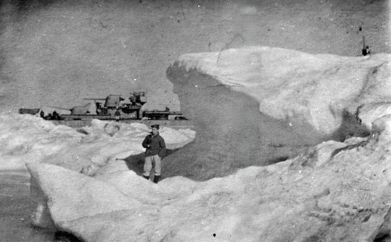 Pronto el «Sensato», que este es el nombre de nuestro buque. fue sacado del muelle. En la milla medida comprobamos las máquinas, la velocidad de desplazamiento, con hélices de hielo, es algo inferior. Eliminamos la desviación de la brújula. Estamos probando los cañones antiaéreos recién instalados.